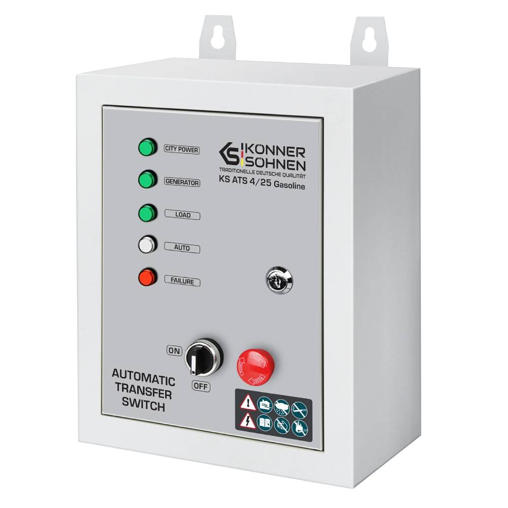 Comutatorul de Transfer Automat (ATS) KS ATS 4/25 Gasoline pentru 230V si 400V porneste automat generatorul si comuta incarcatura pe acesta atunci cand sursa principala de alimentare este intrerupta si opreste automat generatorul la restabilirea alimentarii centrale. Este compatibil cu generatoarele pe benzina tip inverter KS 4000iE S, KS 4100iE, KS 6000iE S, KS 8100iE ATSR, echipate cu un conector de 8 pini pentru conectarea unitatii de automatizare a rezervelor (intrare ATS).