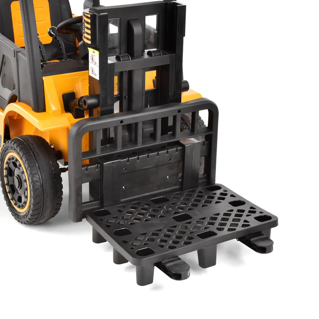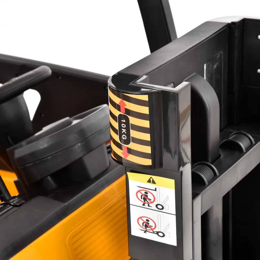 Stivuitor cu acumulator, pentru copii - un stivuitor cu care copiii se vor distra mult. Puteti controla deplasarea inainte si inapoi, puteti regla viteza de la 2 la 6 km/h si, desigur, puteti ridica si cobori furcile din fata. Stivuitorul vine cu un palet de plastic gratuit, pe care copiii pot plasa incarcatura si apoi o pot manipula ca pe un stivuitor adevarat.