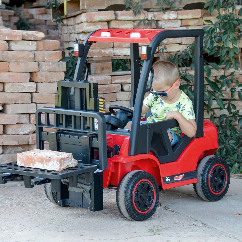 Stivuitor cu acumulator, pentru copii - un stivuitor cu care copiii se vor distra mult. Puteti controla deplasarea inainte si inapoi, puteti regla viteza de la 2 la 6 km/h si, desigur, puteti ridica si cobori furcile din fata. Stivuitorul vine cu un palet de plastic gratuit, pe care copiii pot plasa incarcatura si apoi o pot manipula ca pe un stivuitor adevarat.