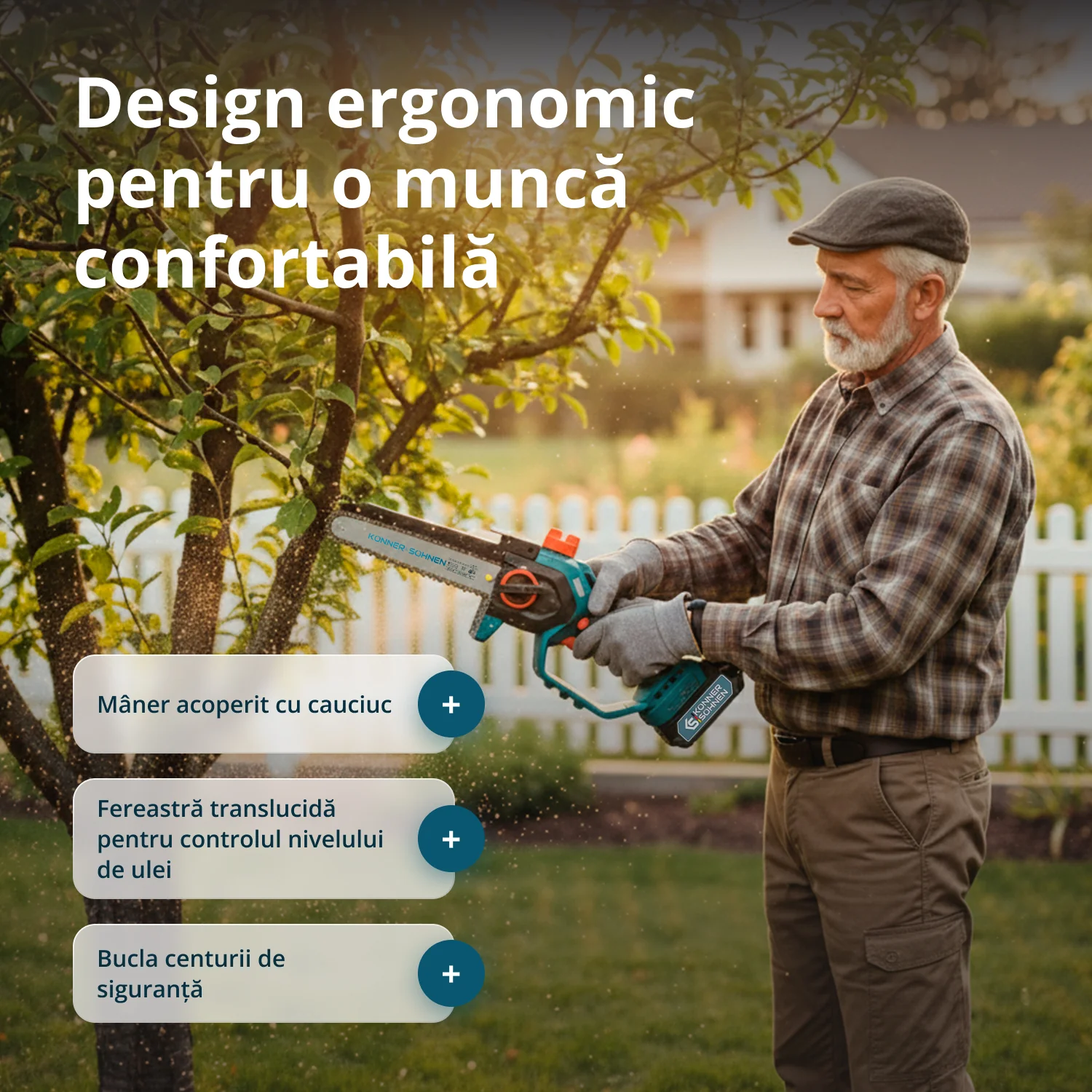 garantie de 5 ani, functioneaza silentios, durabil si stabil. Corpul compact si manerul ergonomic din cauciuc ofera confort si control, chiar si cu o singura mana. Pentru siguranta sunt prevazute un buton de siguranta, protectii si aparatoare, iar pentru comoditate – tensionarea rapida a lantului fara unelte, lubrifierea automata a lantului si o fereastra pentru verificarea nivelului de ulei.