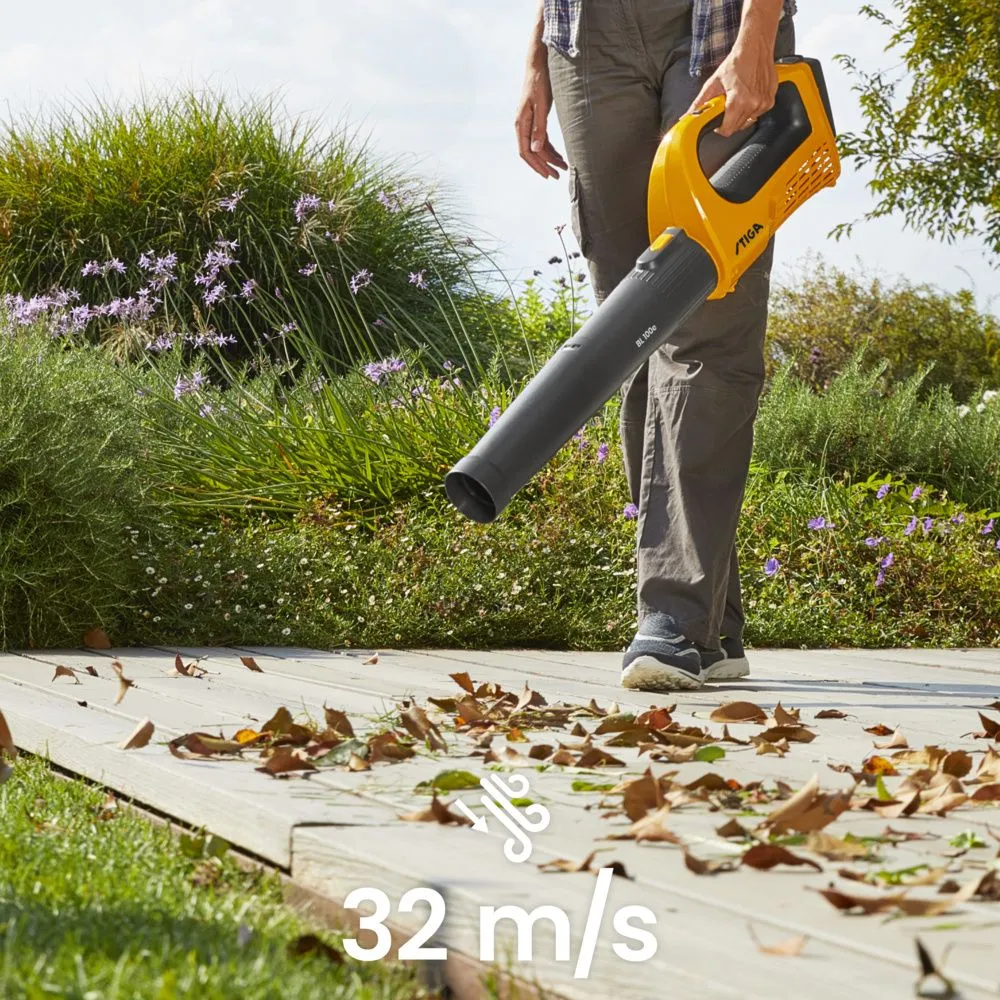 Dotata cu o baterie de 20V 4Ah, kitul BL 100e (cu baterie de 4,0 Ah) este puternic si mai silentios decat o suflanta de frunze pe benzina, oferind timpi de lucru de 40 de minute la viteza normala si 20 de minute la viteza crescuta.