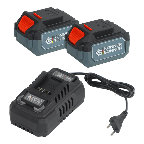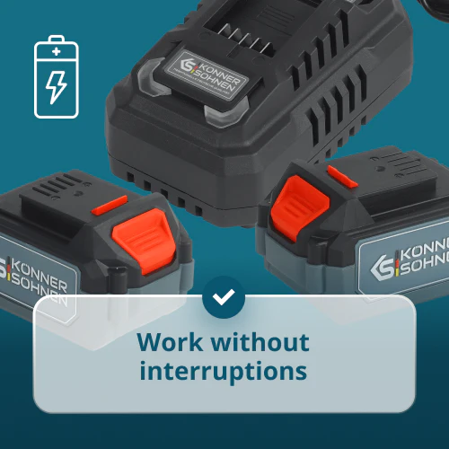 Doua baterii de 20V 4 Ah si incarcator rapid de 4,5 A in pachet ofera un functionare continua, in timp ce o baterie se incarca, cealalta functioneaza.