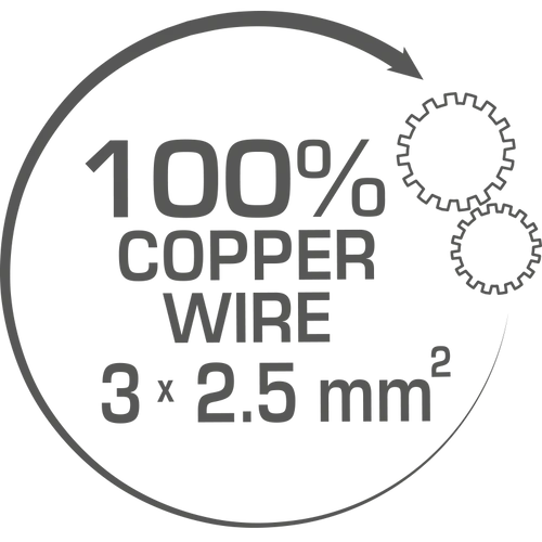 Prelungitorul este echipat cu un cablu cu miez 100% din cupru 3x2.5 mm2, si are un fir de impamantare galben-verde. Doar cuprul poate rezista la sarcini maxime pe termen lung, ceea ce face cablul durabil si ii prelungeste viata de functionare.