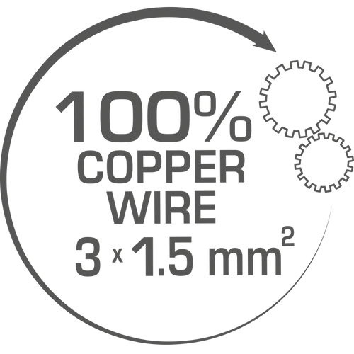 Prelungitorul este echipat cu un cablu cu miez 100% din cupru 3x1.5 mm2, si are un fir de impamantare galben-verde. Doar cuprul poate rezista la sarcini maxime pe termen lung, ceea ce face cablul durabil si ii prelungeste viata de functionare. Cablul este certificat de TUV Rheinland ca fiind conform cu norma EN 50525-2-21, conform RoHS.
