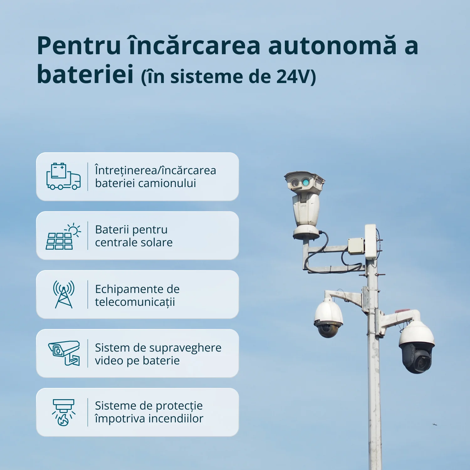 Solutie ideala pentru incarcarea acumulatoarelor in sisteme de 24V, precum statii solare, supraveghere video, sisteme de securitate, intretinerea acumulatoarelor in vehicule parcate.