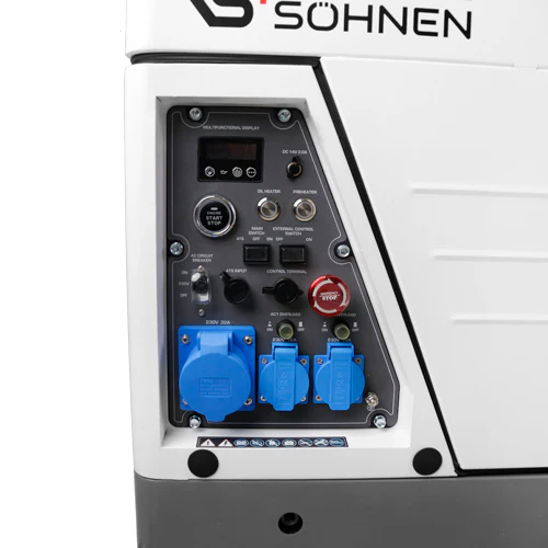 Panoul are o dispunere comoda a elementelor si un afisaj LED multifunctional. Acesta afiseaza parametrii cheie ai functionarii generatorului — tensiune, frecventa, numarul de ore de functionare si durata ultimei sesiuni — permitand monitorizarea si intretinerea la timp a generatorului.