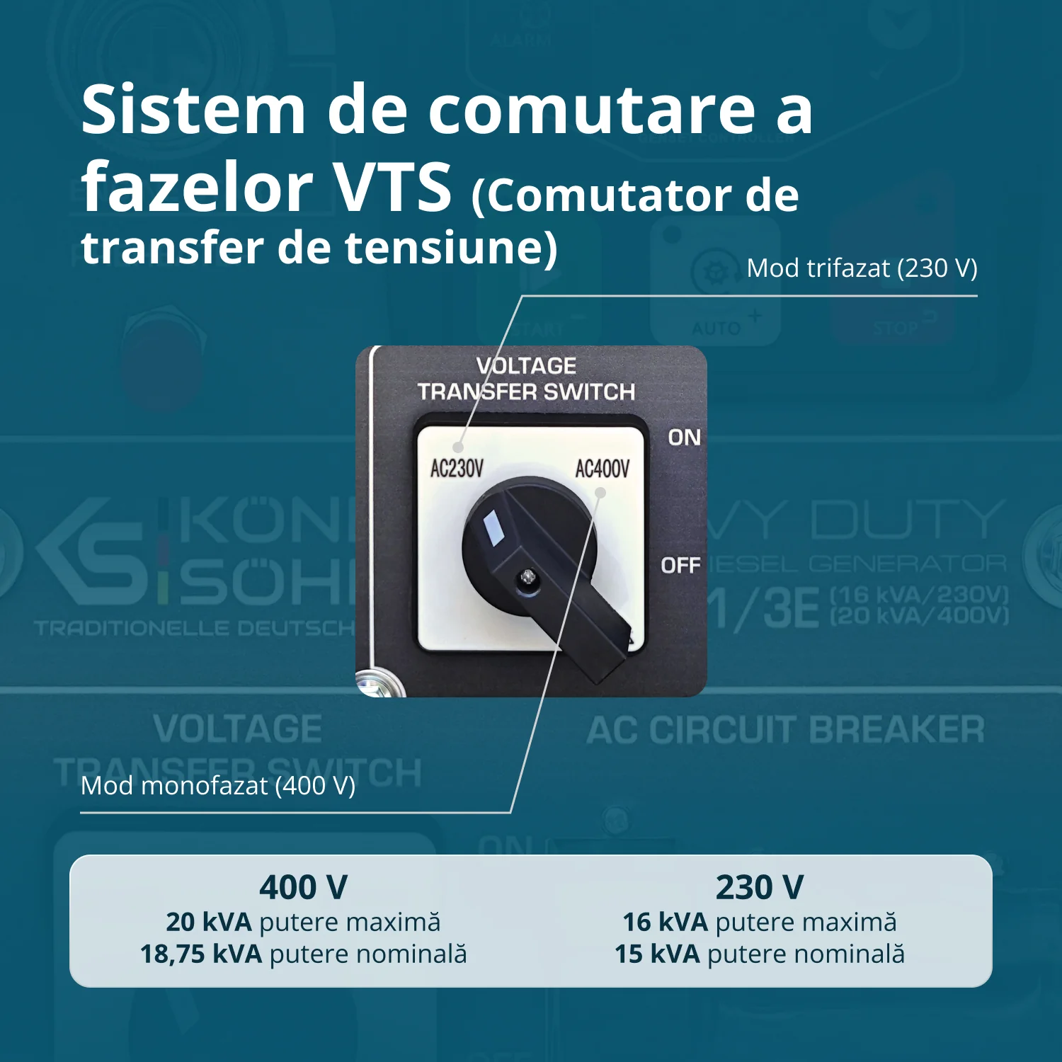 Generatorul KS 16-1/3E este echipat cu un sistem inovator unic de comutare a fazelor VTS (Voltage Transfer Switch), care permite utilizarea unui singur generator pentru consumatori monofazati (230V) si trifazati (400V) fara pierdere semnificativa de putere. Nu este necesara achizitionarea a doua generatoare separate.