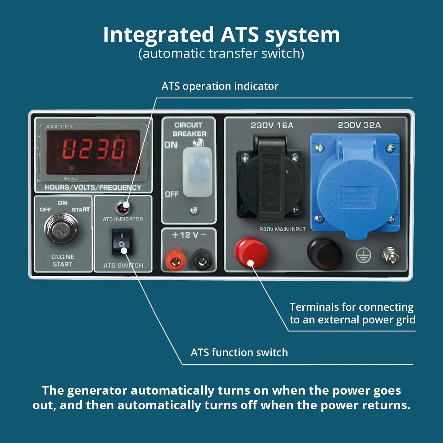 Panoul de control al generatorului cu functia ATS este echipat cu: borne pentru conectarea la alimentarea electrica, comutator pentru activarea functiei ATS si indicator pentru monitorizarea functionarii ATS.