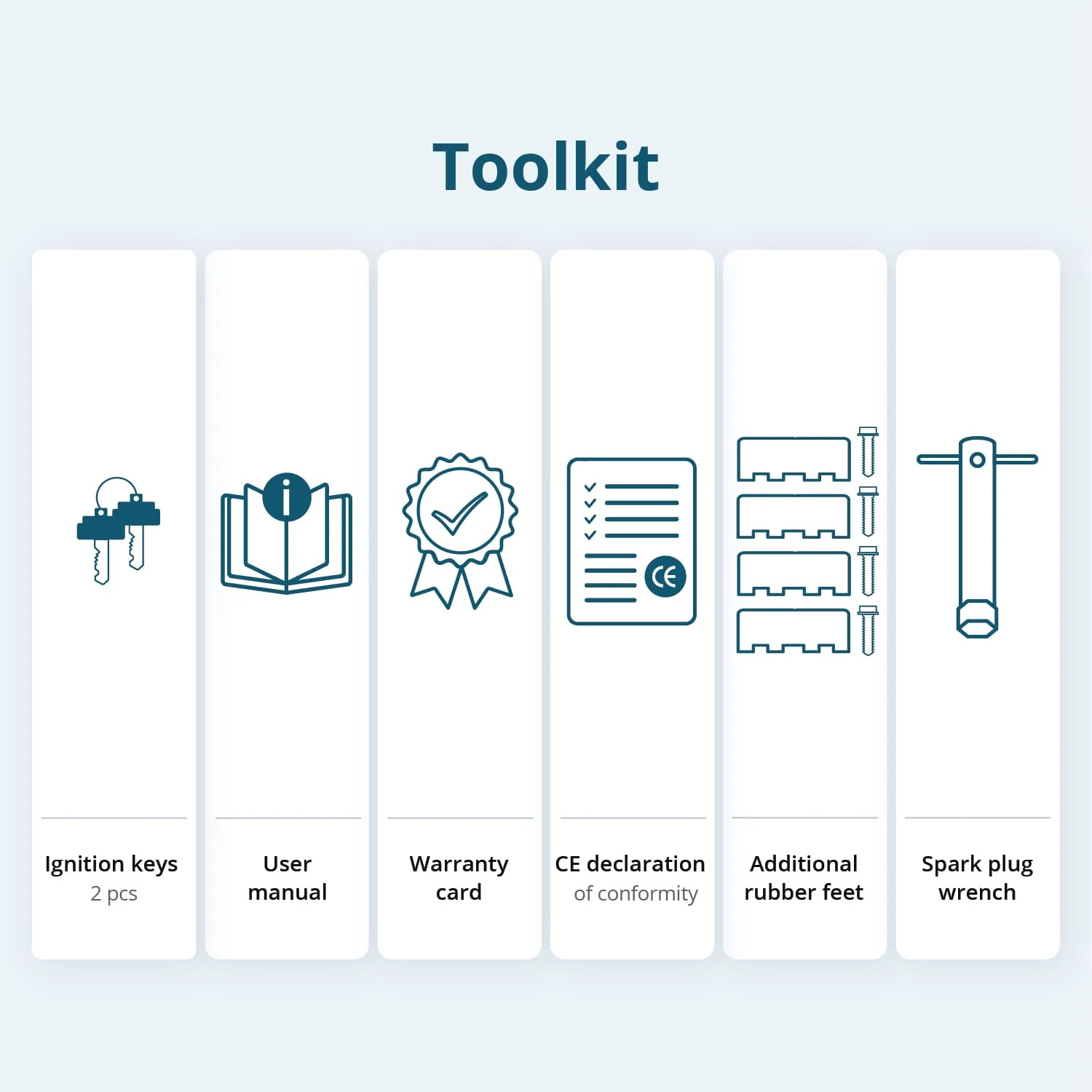 ATENTIE! Produsul se vinde fara ulei de motor si benzina. Inainte de prima pornire, este necesar sa adaugati ulei de motor pentru motoare pe benzina in patru timpi. Va recomandam uleiul 10W-30 sau 10W-40. Verificati nivelul uleiului inainte de fiecare pornire. Utilizati doar benzina fara plumb cu un indice de octan 90–95, care contine maximum 10% etanol.