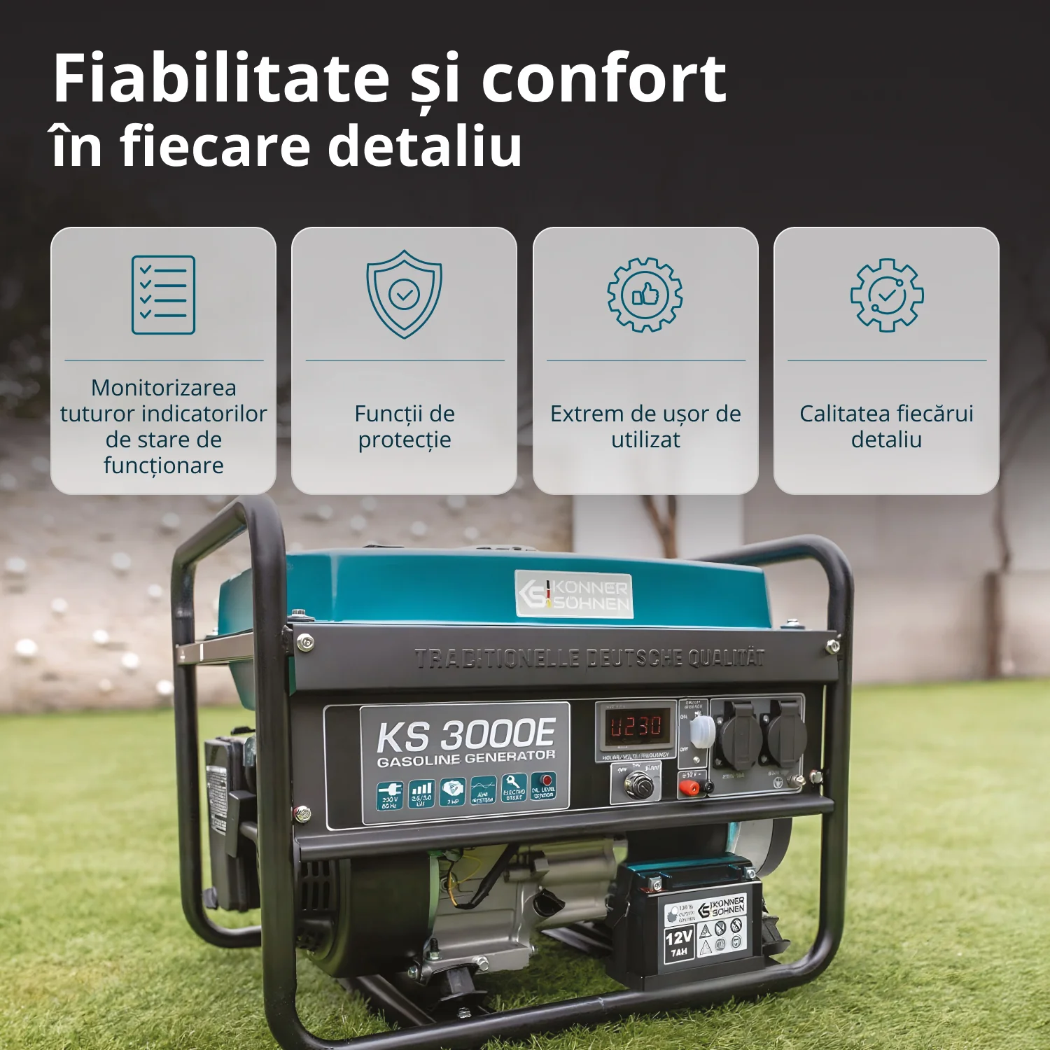 Fiecare motor are un numar de serie individual, permitand astfel controlul calitatii productiei si al service-ului. Motoarele Konner & Sohnen se disting prin pornirea usoara si nivelul redus de vibratii. Gama de generatoare pe benzina KS 2900 este echipata cu un motor fiabil, monocilindric, de 6,5 CP.