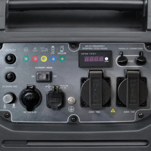 Panoul de control ergonomic este echipat cu: afisaj LED, prize de 16A, indicatori ai starii de functionare, o priza auto universala de 12V si un buton RESET pentru repornirea sistemului de control (in cazul declansarii protectiei electronice la suprasarcina sau scurtcircuit) si restabilirea tensiunii fara a opri motorul.