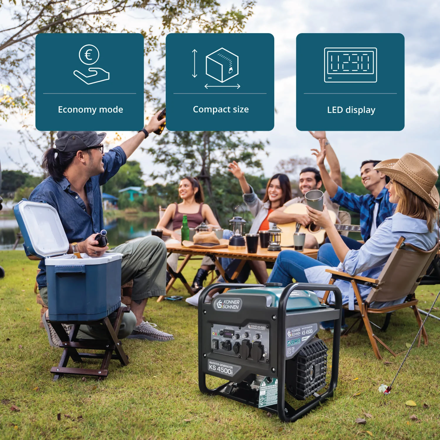 Generatorul invertor pe benzina KS 4500i cu o putere nominala de 4,2 kW asigura o alimentare stabila si de inalta calitate pentru electrocasnice, garantand functionarea neintrerupta a birourilor, magazinelor, micilor afaceri, centrelor medicale sau a sculelor electrice de mica putere in ateliere.