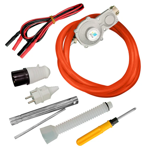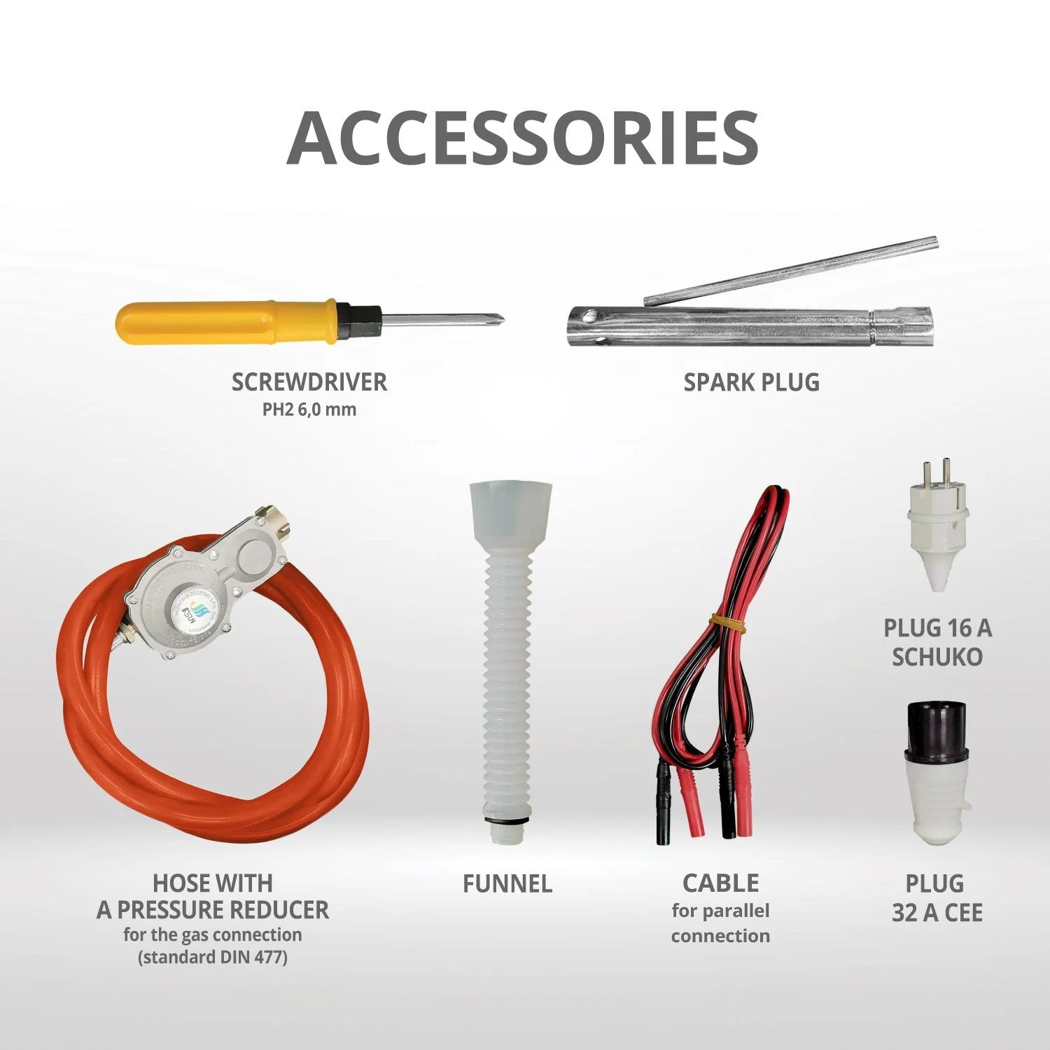 Generatorul este echipat cu accesorii suplimentare: cheie pentru bujii, palnie pentru turnarea comoda a uleiului de motor, cablu pentru conexiune in paralel, furtun cu reductor, priza Schuko de 16 A, surubelnita PH2 de 6,0 mm, stecher 32 A CEE. Butelia de gaz nu este inclusa in pachetul de livrare.