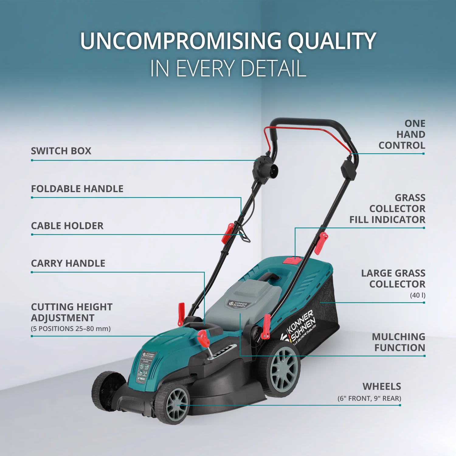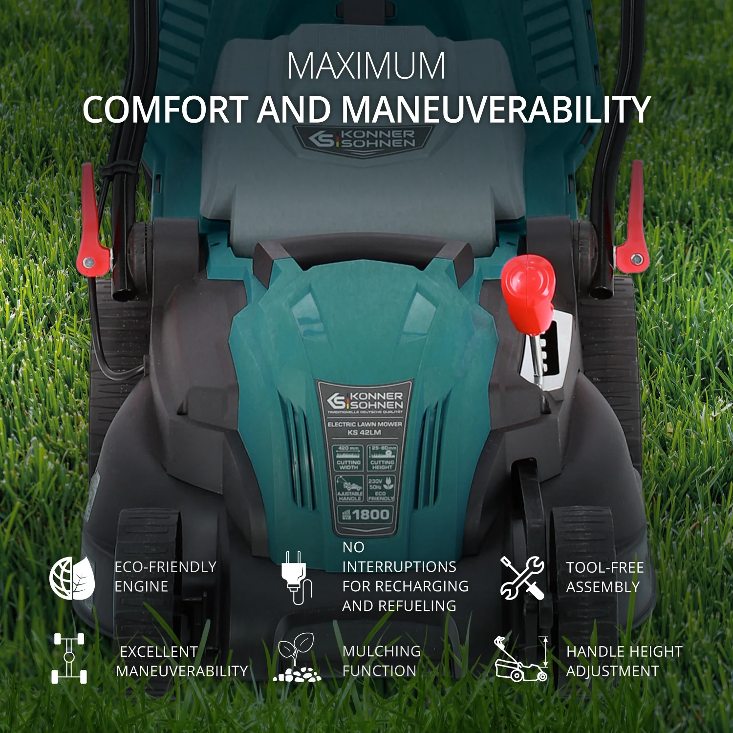 Masinile de tuns iarba electrice Konner & Sohnen® au o constructie simpla, ceea ce face ca pregatirea pentru utilizare, intretinerea sau depozitarea lor sa fie rapide, usoare si sa nu necesite unelte suplimentare.