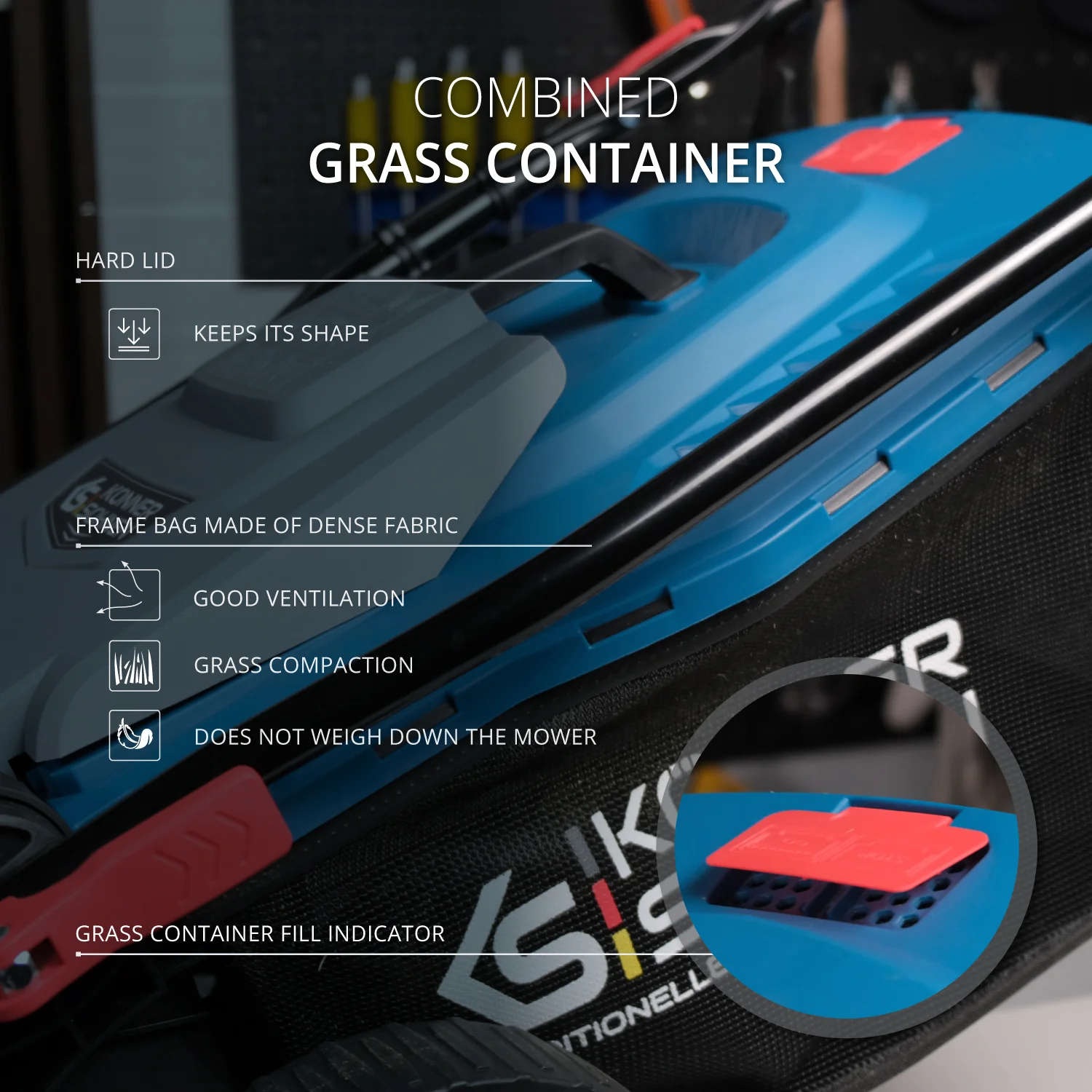 Modelul de masina de tuns iarba KS 42LM dispune de o functie de mulcire, extrem de utila pentru fertilizarea naturala a gazonului si imbunatatirea sanatatii acestuia. Latimea de taiere a masinii atinge 42 cm, ceea ce garanteaza o tundere si mulcire eficiente, chiar si pe suprafete extinse de gazon.