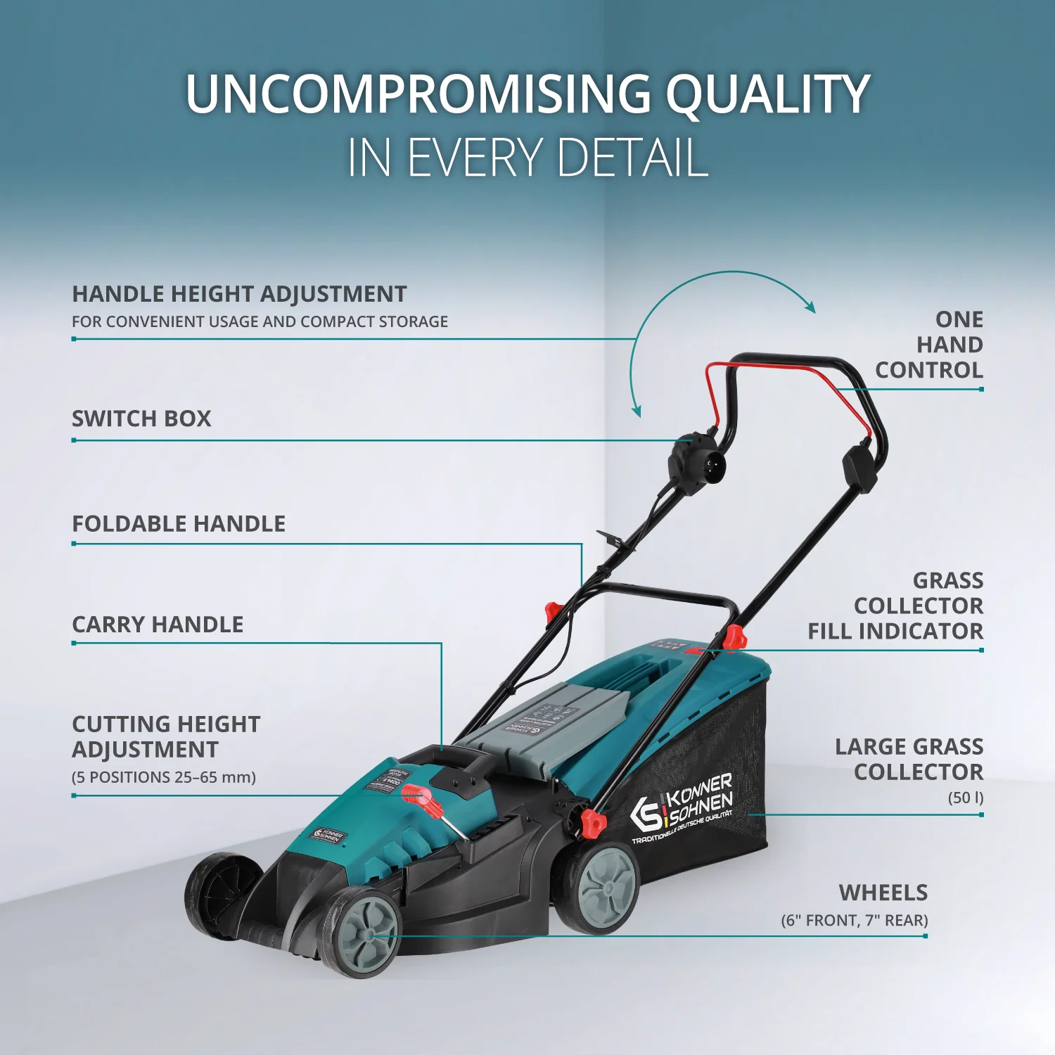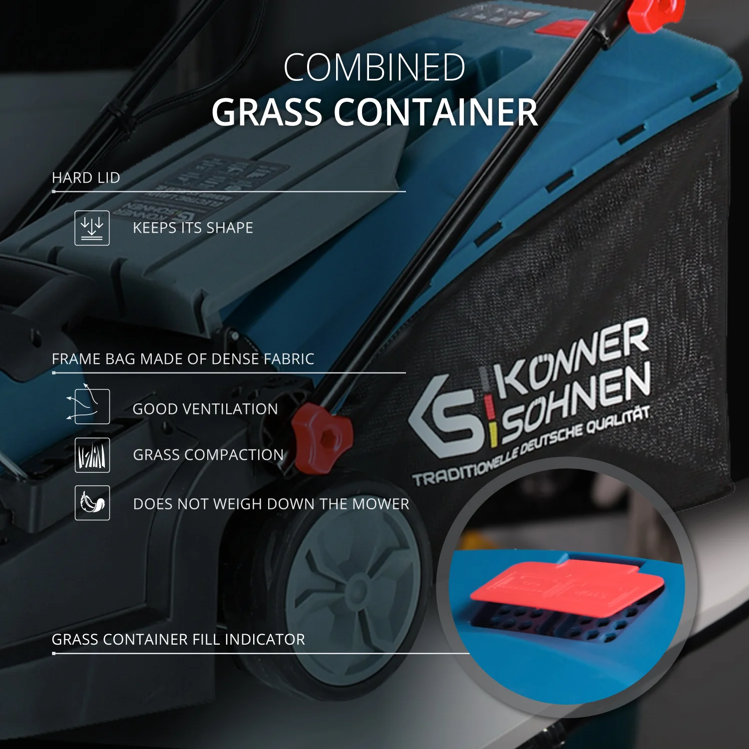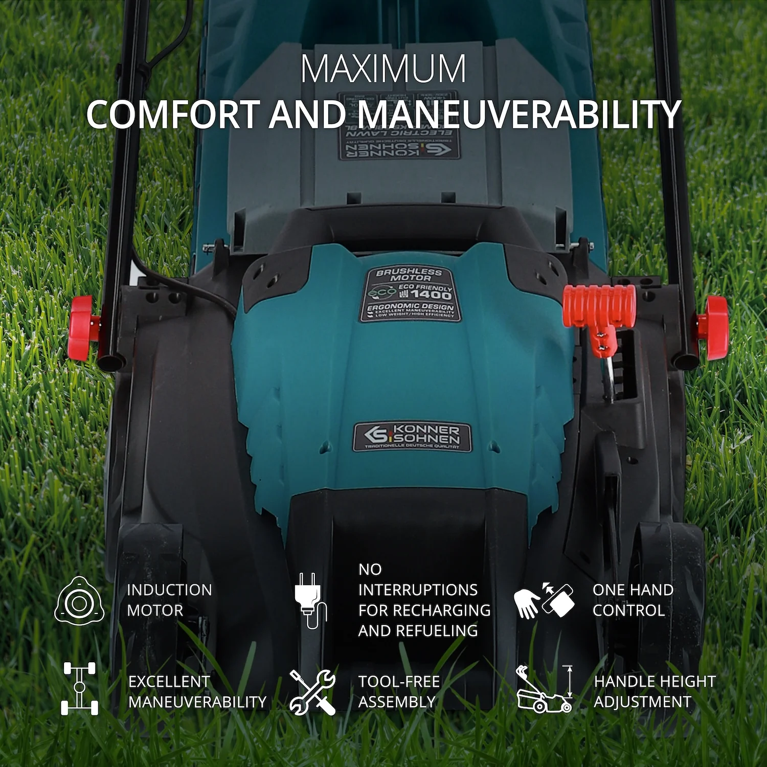 Masinile de tuns iarba electrice Konner & Sohnen® au o constructie simpla, ceea ce face ca pregatirea pentru utilizare, intretinerea sau depozitarea lor sa fie rapide, usoare si sa nu necesite unelte suplimentare.