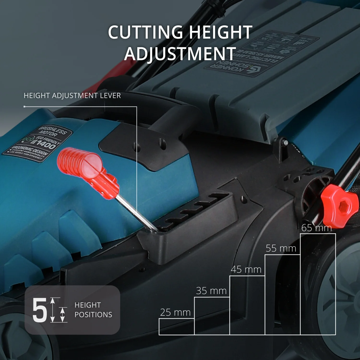 Masinile de tuns iarba dispun de un levier practic pentru ajustarea inaltimii de taiere, cu 5 trepte disponibile, intre 25 mm si 65 mm. Aceasta functie permite personalizarea taierii in functie de preferintele utilizatorului, asigurand o inaltime optima a gazonului, indiferent de cerinte.