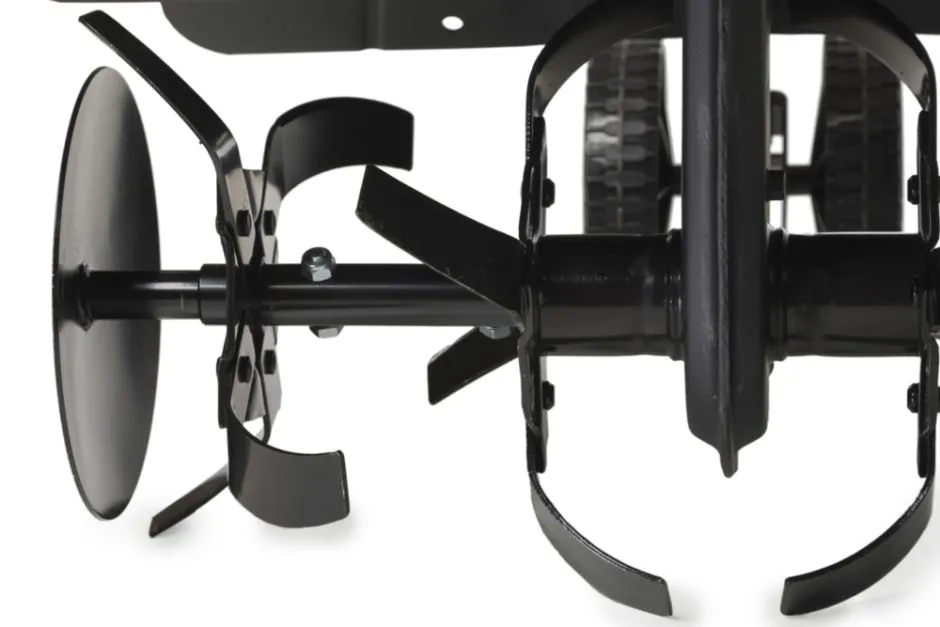 Motosapa cu motor pe benzina de 123 cmc, latime de lucru de 50 cm, adancime de lucru de 20 cm, patru roti metalice si doua roti spate.