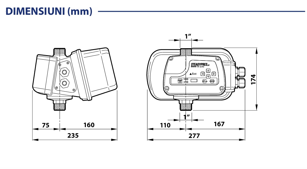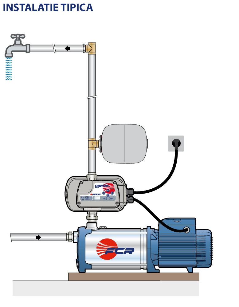 STEADYPRES se instaleaza la iesirea electropompei, prin modularea valorii si frecventei tensiunii de iesire, permite variarea vitezei de rotatie a motorului in functie de cantitatea de apa necesara, garantand astfel o presiune constanta in sistem.