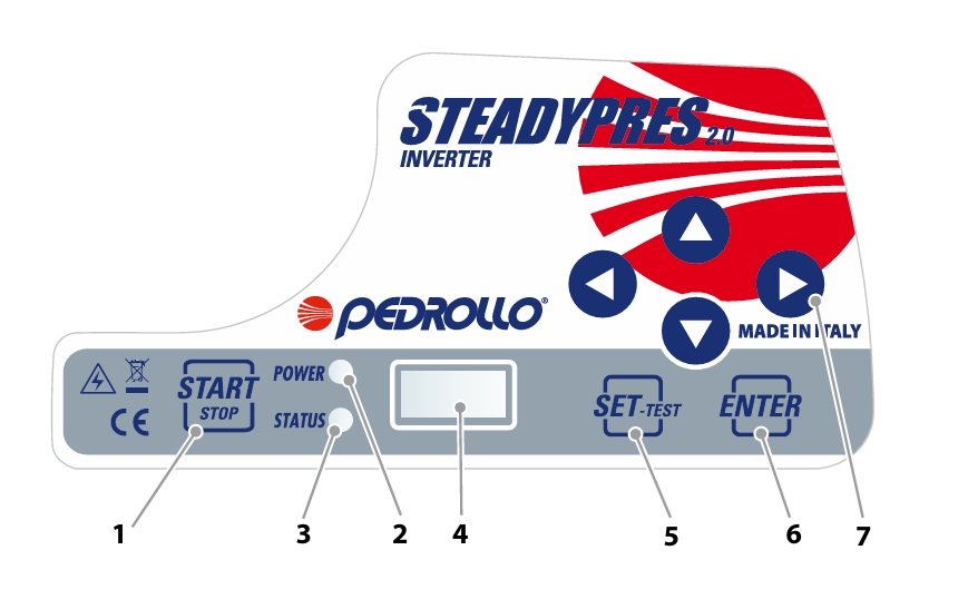 - Tastatura va permite sa accesati si sa navigati prin meniurile de configurare pentru a seta si vizualiza diferiti parametri de functionare, precum: presiunea sistemului, frecventa de operare, curentul absorbit si mesajele de alarma.