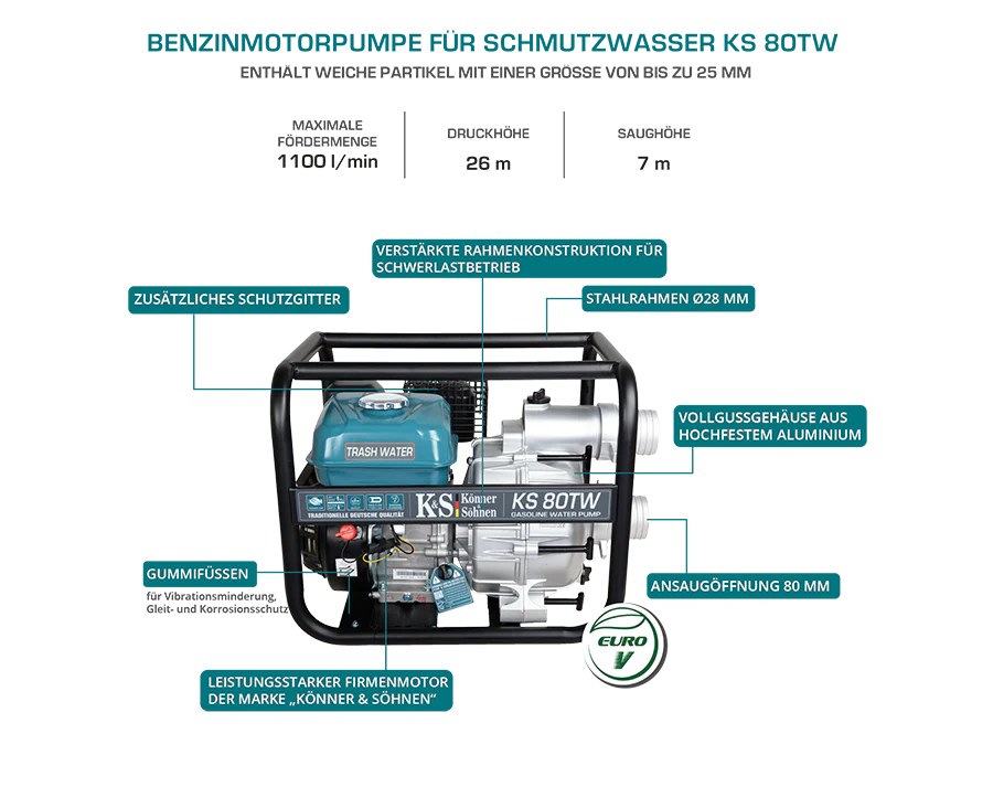 Motoarele proprii utilizate in motopompele „Konner & Sohnen” sunt durabile si economice, fiind fabricate sub supravegherea stricta a inginerilor germani. Motorul fiabil Konner & Sohnen respecta toate standardele europene de calitate, inclusiv standardul ecologic modern EURO V.