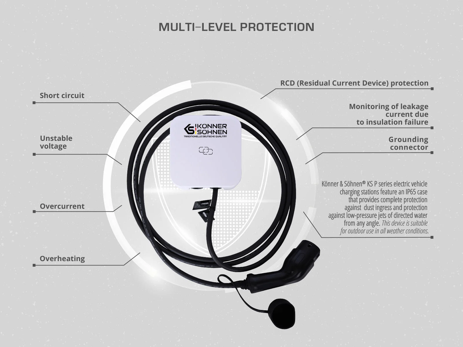 Statiile de incarcare din seria KS P de la Konner & Sohnen® sunt proiectate cu o carcasa de clasa IP65, care garanteaza protectie totala impotriva prafului si a jeturilor de apa sub presiune, din orice directie. Rezistenta si fiabila, aceasta statie este perfecta pentru utilizarea in aer liber, indiferent de conditiile de mediu.