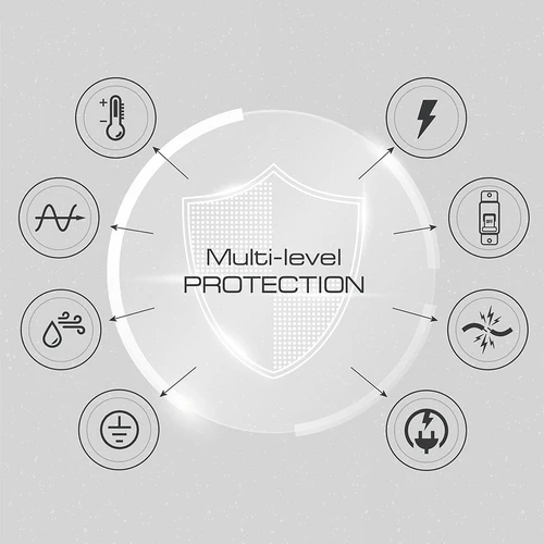 Statia este proiectata pentru incarcarea rapida a vehiculelor electrice, fiind echipata cu un sistem avansat de protectie pe mai multe niveluri impotriva supraincalzirii, tensiunii instabile, supracurentului, suprasarcinii, scurtcircuitelor, conditiilor meteorologice nefavorabile si prafului extern. Dispune de un intrerupator automat (MCB - micro circuit breaker), dispozitiv de curent rezidual (RCD), impamantare, monitorizare a scurgerilor de curent cauzate de defecte de izolatie si detectarea eventualelor defectiuni, avand clasa de protectie IP54. Gratie acestei statii, bateria vehiculului electric poate fi incarcata in mod sigur si eficient, la o capacitate mai mare comparativ cu incarcatoarele conectate direct la o priza obisnuita.