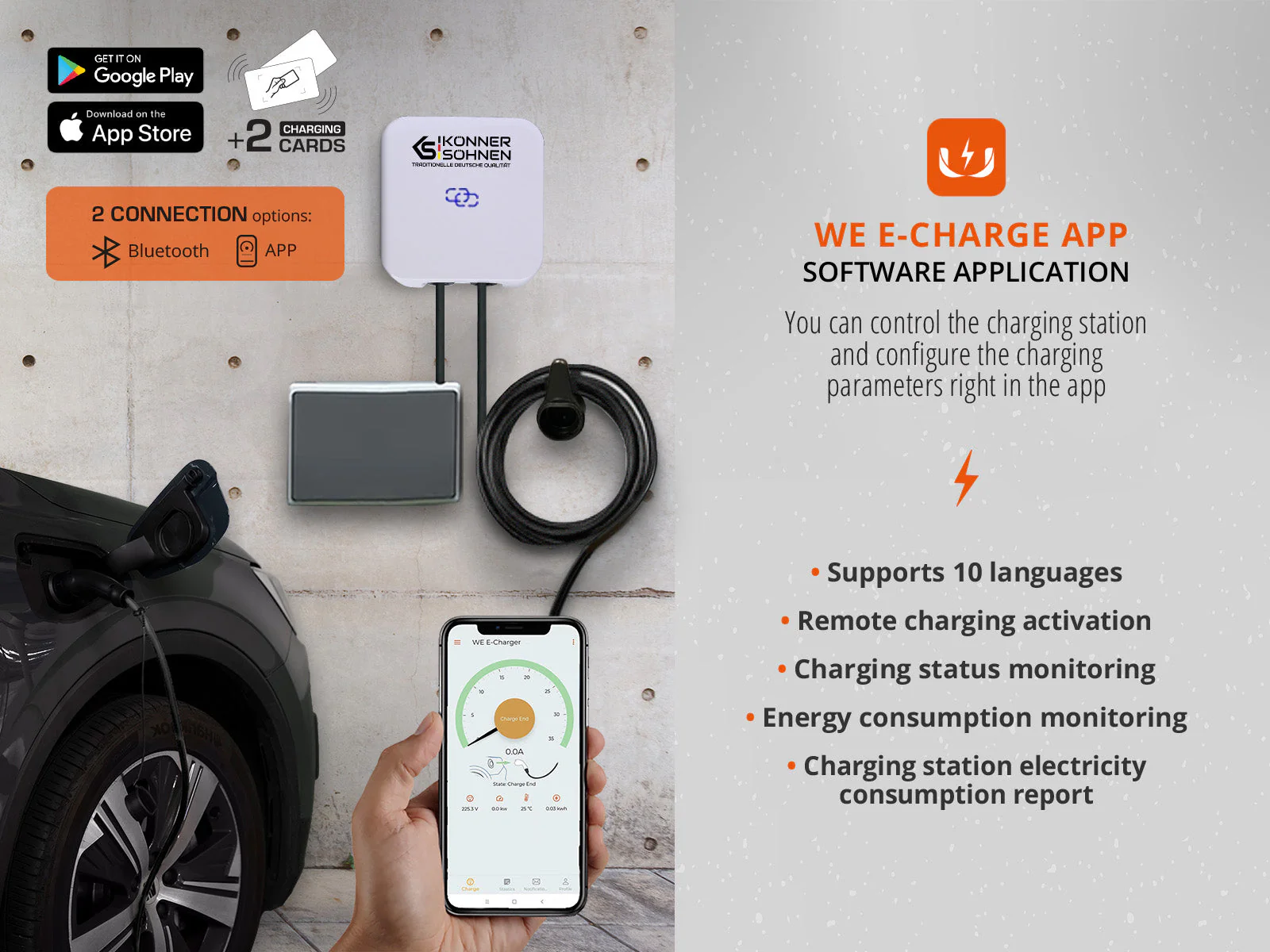 Aplicatia este disponibila atat pentru iOS, cat si pentru Android, ofera functionalitati precum: activarea/dezactivarea de la distanta a incarcarii, monitorizarea starii incarcarii, gestionarea consumului de energie si generarea de rapoarte detaliate privind consumul electric al statiei de incarcare. Este disponibila in 10 limbi diferite.