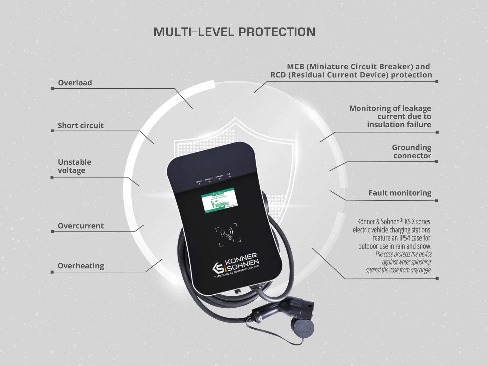 Statiile de incarcare pentru vehicule electrice din seria KS X de la Konner & Sohnen® sunt construite intr-o carcasa cu grad de protectie IP54, ceea ce le face potrivite pentru utilizare in aer liber, indiferent de conditii, inclusiv ploaie sau zapada. Carcasa protejeaza impotriva patrunderii stropilor de apa din orice unghi. Afisajul LCD de 4,3 inci prezinta informatii esentiale, iar indicatoarele LED ofera detalii despre starea incarcarii. Carcasa robusta, realizata din materiale de inalta calitate, este completata de un panou frontal din sticla securizata.