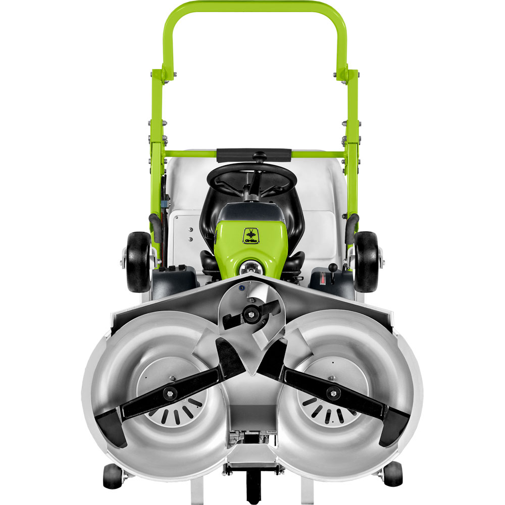 doua lame contrarotative (care nu sunt temporizate) plus o lama frontala mica. Este o platforma de cosit cu adevarat frontala: 50% din suprafata sa este libera de obstacole, asigurand astfel o vizibilitate perfecta asupra zonei de lucru.