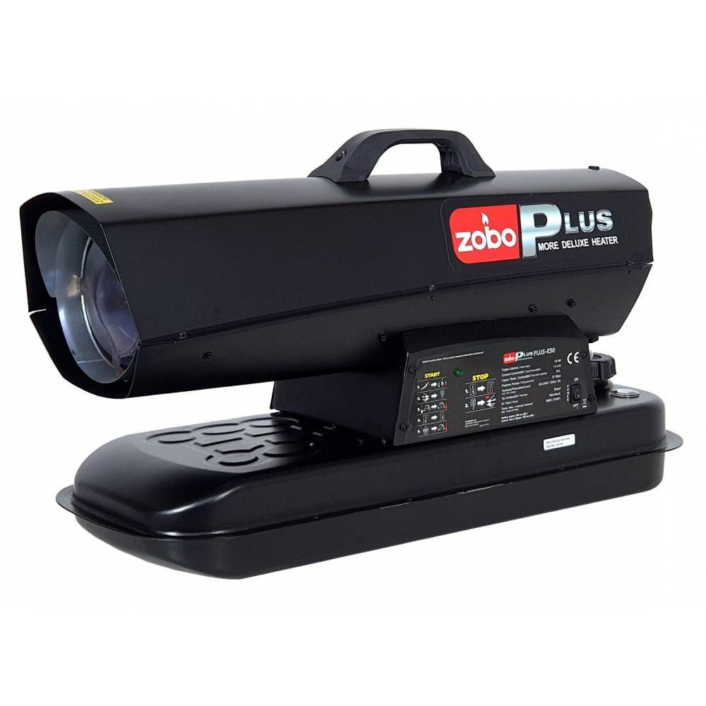 Tun de caldura (generator de aer cald) pe motorina cu ardere directa Zobo PLUS-K50, putere calorica 15 kW, volum incalzit 300 mc. Rezervor de motorina de 19 litri. Alimentare la retea 220 / 230 V.