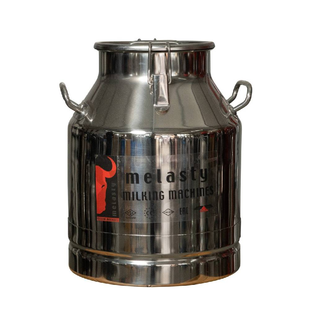 Bidon MELASTY din inox, cu capacitate de 25 de litri. Destinat transportului pentru lapte, dotat cu cleme de prindere etansa si capac.